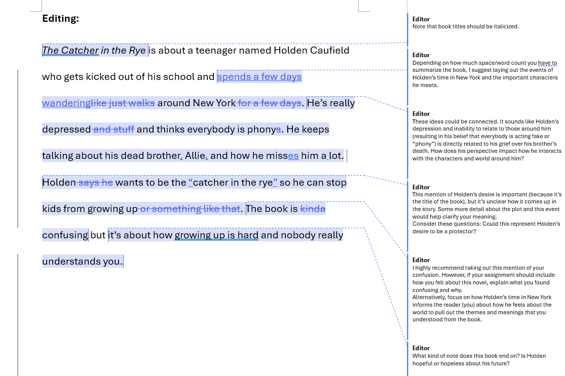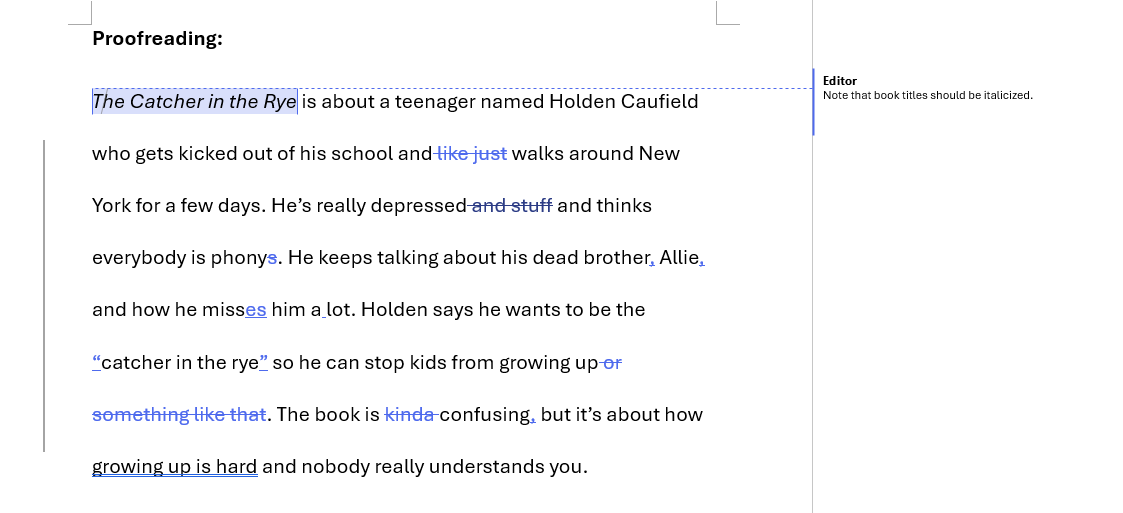 Take a look at this student-written summary of Catcher in the Rye and compare the editor's work in the edited version and the proofread version: